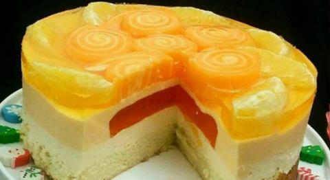 6. ژله ی پرتقالی رو از یخجال خارج کرده کمی کوچکتر از کف قالب کمربندی با کاتر برش بدید و روی دسر نیم بند شده بزارید