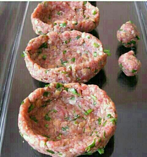 یک عدد پیاز را رنده کرده، آب آن را جدا کرده ولی دور نمیریزیم. تفاله پیاز را با گوشت چرخ کرده همراه با فلفل دلمه ای رنگی و کمی آرد، تخم مرغ، نمک و ریحان یا جعفری یا نعناع (سبزیجات معطر) اضافه کرده و خوب ورز می دهیم و یک ساعت در یخچال قرار داده تا بیات شود. سپس به شکل کاسه درآورده. با دست نم دار راحت شکل میگیره. کاسه ها را در ظرفی چیده و در فر از قبل گرم شده با درجه 180درجه به مدت 15 دقیقه میپزیم بعد کاسه ها را بیرون آورده و به سلیقه و ذایقه خودتون توشو پر میکنیم.