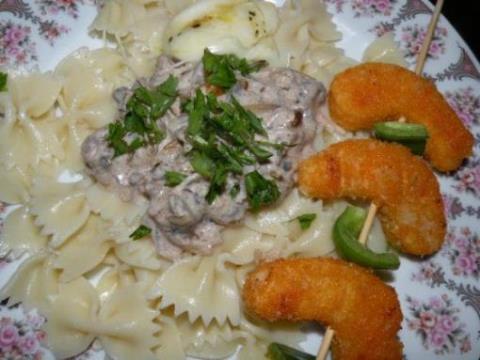 گام ۸: سپس از سس قارچ روي آن ريخته و همراه ميگو ها سرو كنيد.