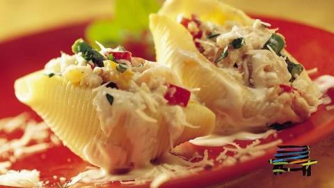 از مواد بدست آمده قاشق قاشق داخل پاستاها ریخته و داخل آنها را پر میکنیم.پاستاهای پر شده را مانند عکس بالا در دیس مورد نظر و به صورت دایره ای و مرتب شروع به چیدن کرده طوری که در نهایت به صورت گل در بیاد و جلوه ی بیشتری به سفره میهمانی گرم شما بدهد.
