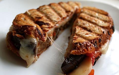 ابتدا بادمجان ها را شسته، خشك كرده و آنها را حلقه حلقه بریده و در كره یا روغن سرخ میكنیم. بادمجان، پنیرسفید و نصف پنیر پیتزا، جعفری، نمك و فلفل را مخلوط میكنیم. دستگاه ساندویچ ساز را روشن كرده تا گرم شود. روی یك نان تست یك قاشق غذاخوری از مواد ریخته و رویش پنیر پیتزا میریزیم و نان دیگر را روی آن قرار داده و كمی فشار میدهیم تا به هم بچسبند. باقی نانها را نیز به همین ترتیب آماده میكنیم. نانهای آماده را در دستگاه قرار داده تا ساندویچ ها آماده شوند.
