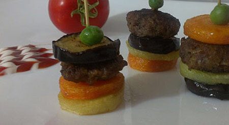 حالا به ترتیب از هر کدام از سبزیجات + کباب روی هم می چینیم. بعد یک خلال دندان فرو می کنیم و تزیین کرده و در ظرف می چینیم .