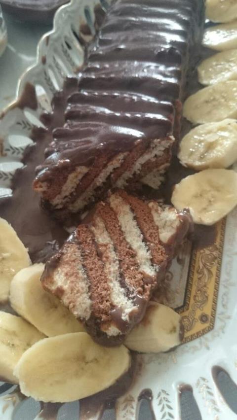 مجددا یه لایه دیگر بیسکوییت ،گردوی خرد شده و موز را چیده و مایع شکلاتی داغ را اضافه کنید.