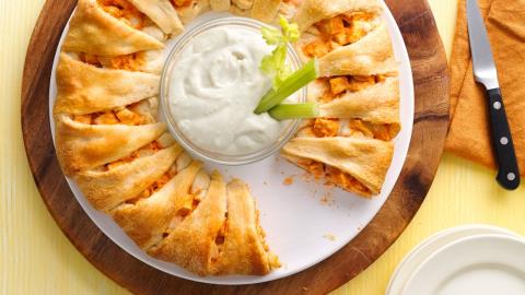 نیمی از پنیر ها را در قاعده مثلث ها بریزید. روی آن مخلوط مرغ باربیکیو را ریخته و دوباره یک لایه پنیر بریزید.