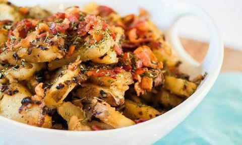 ⭕️5. جعفری یا گشنیز تازه و خرد شده را روی سیب زمینی ها بپاشید و نمک و فلفل بزنید .
