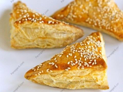 مثلث ها رو در فر از قبل گرم شده با دمای ۱۸۰ درجه سانتیگراد قرار بدید تا وقتی که روشون طلایی بشه و پف کنن. زمان پخت با توجه به فر ممکنه متفاوت باشه.